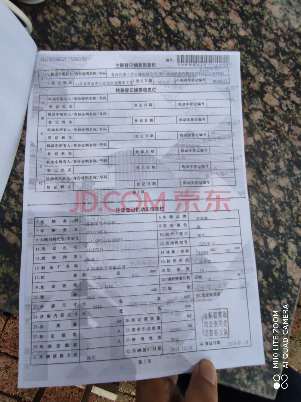 车辆存放于青岛科源大件运输有限公司,车牌号为鲁UH8272、规格及型号为东风牌DFH4250CX2、2019年1月购置